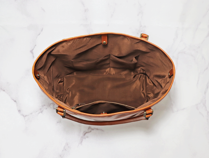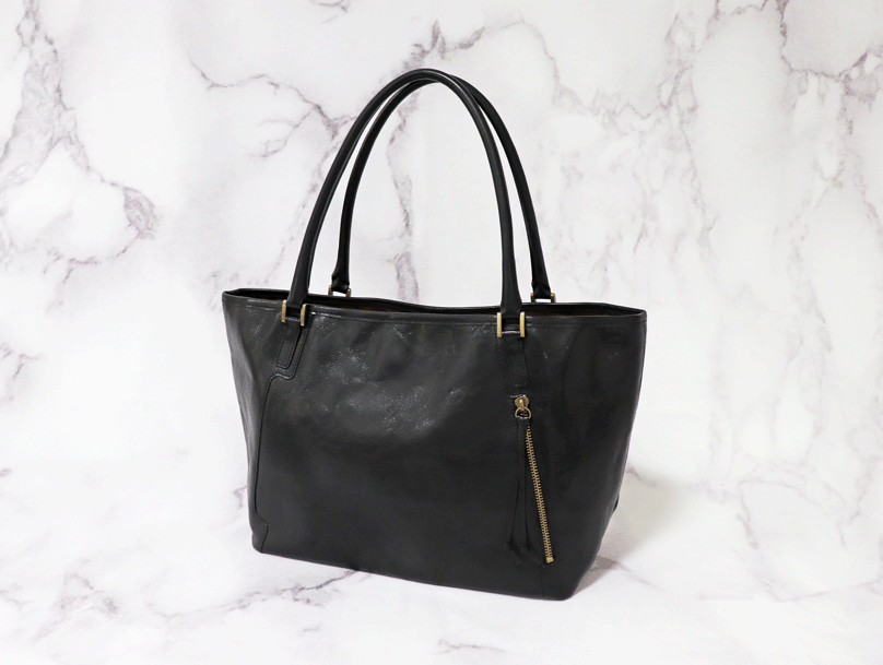 内側にはポケットが3箇所ありますが、外側にも切り替えのデザインを活かしたファスナーポケットがあり、余計な厚みを持たせることなく、収納しやすいトートバッグを目指しました。