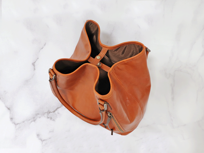 口を留めるメインのスナップボタン以外に、両端にもスナップボタンがあり、留めていただくとトートバッグからコロンとした形に変形します。