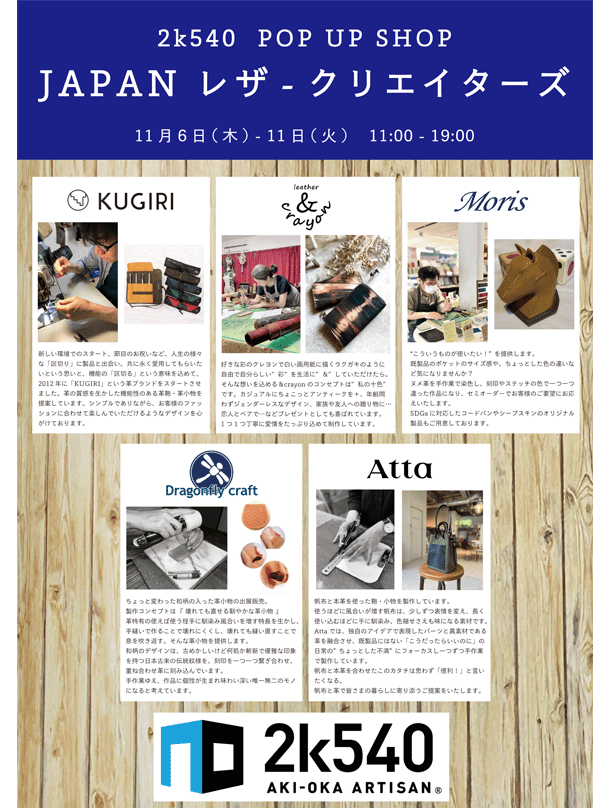 7月に続いてものづくりの街2k540 AKI-OKA ARTISANにて「JAPANレザークリエイターズ」として5ブランドで出店致します。